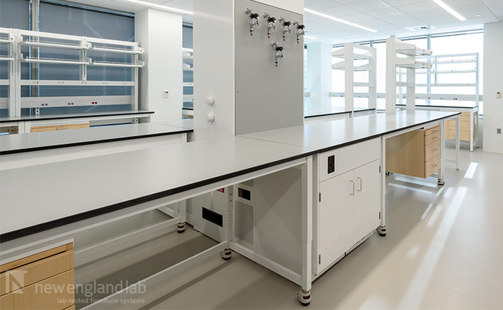 The 225,000-square-foot biomedical research facility at 300 Binney Street in Cambridge, MA, has recently been renovated and expanded to support the Broad Institute’s research programs. The new space features Optima Freestanding Benches that come pre-wired and pre-plumbed, with two-tier shelving and silver-gray phenolic tops. You’ll also find Cambridge Series tables placed throughout the labs for added flexibility. To bring some depth and design to the space, plain sliced veneer casework and maple suspended cabinets were used. Pre-plumbed and pre-wired fume hoods were installed across the facility for safe experimentation and energy efficiency. Adjustable-height wall shelving in powder-coated steel accommodates plenty of storage throughout the lab. This state-of-the-art facility is designed to support the innovative research the Broad Institute is known for.